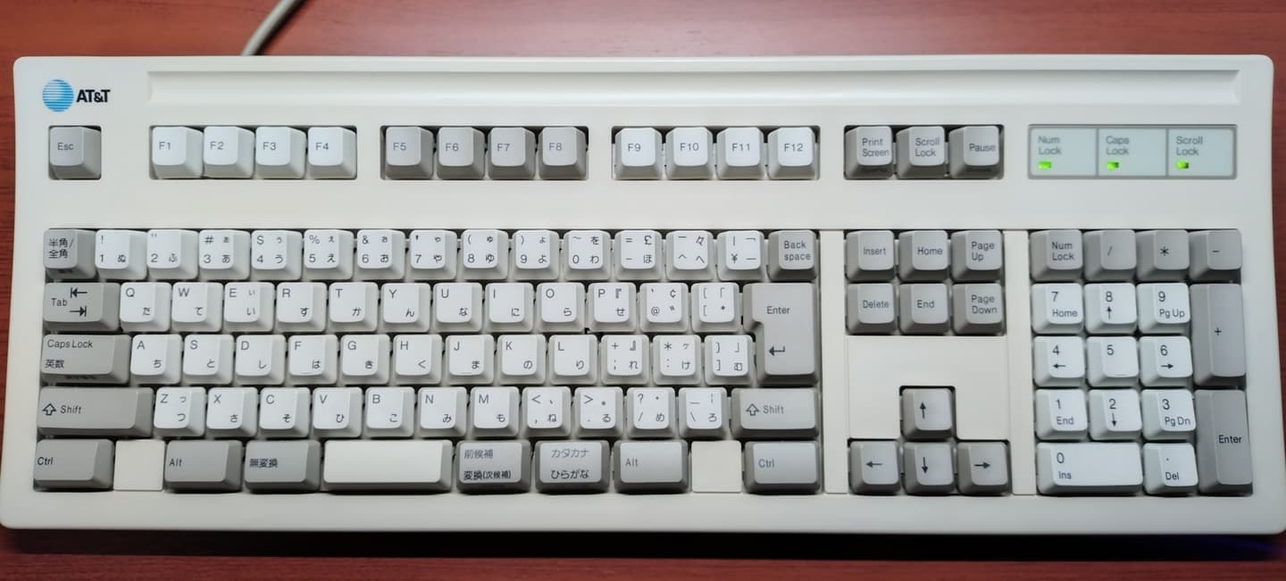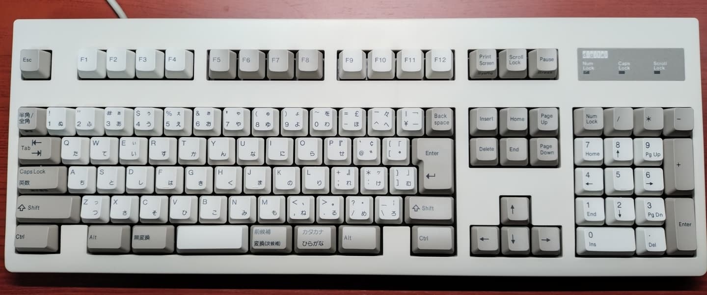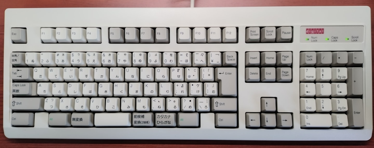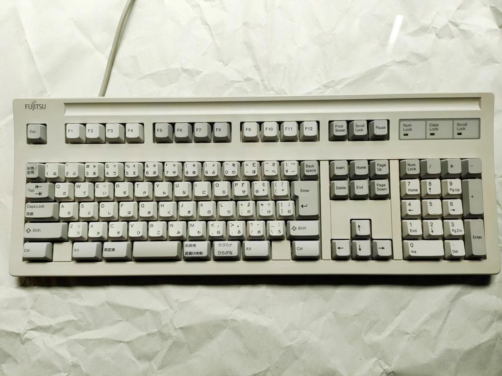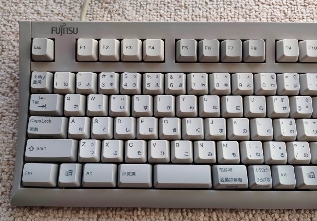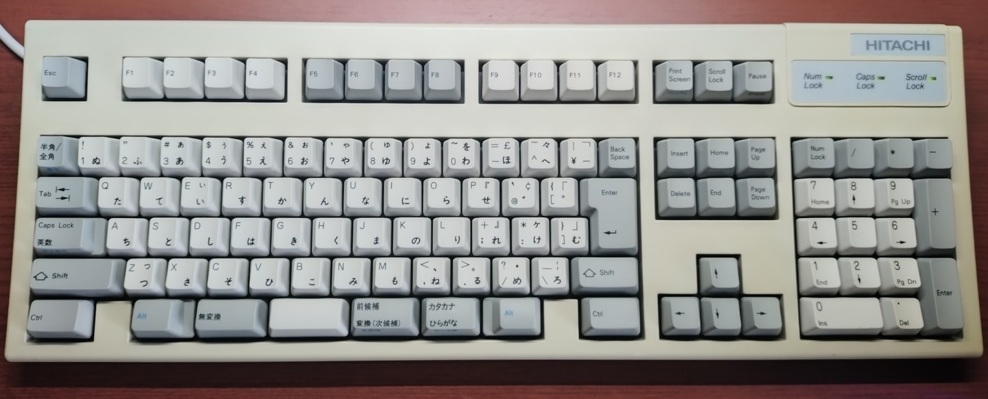 IBM 79F0167(5576-A01)「Model M」がANSI配列キーボードの始祖だとしたら、こちらの5576-A01はJIS配列の原点と呼んで差し支えない名機です。Model Mと同様のバックリングスプリング機構を採用していますが、ケースやハウジングの精度はこちらの方が高く、タイピングの反響音も心なしか上質な感じがします。「大理石をパチンコ玉で叩いたような音」とはよく言ったものです。 |