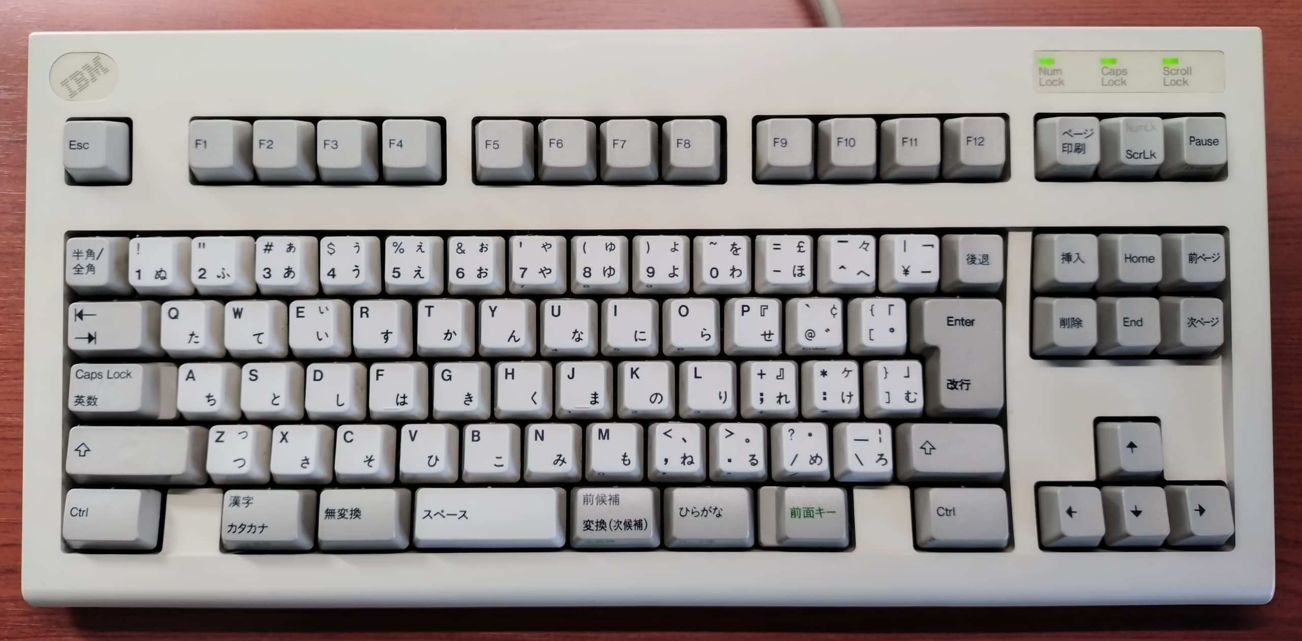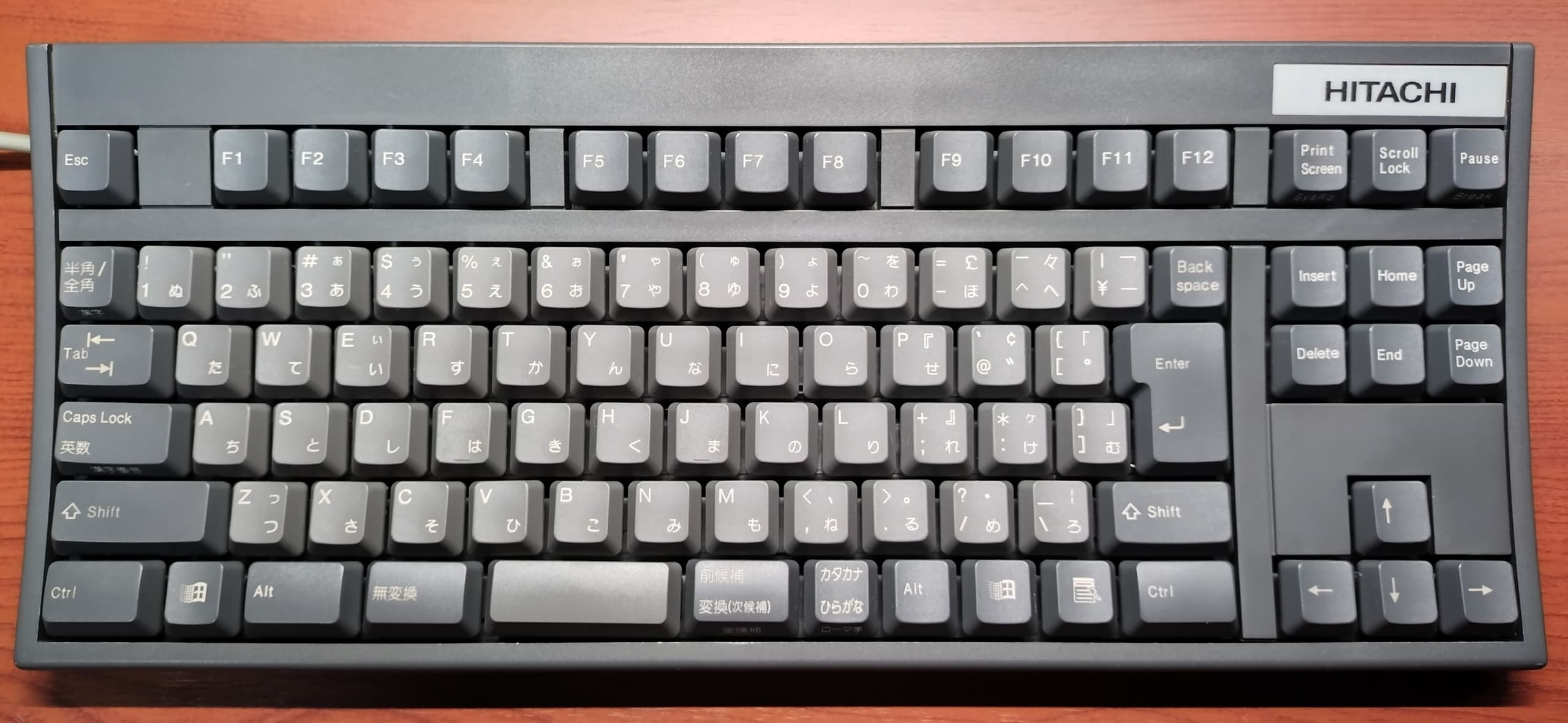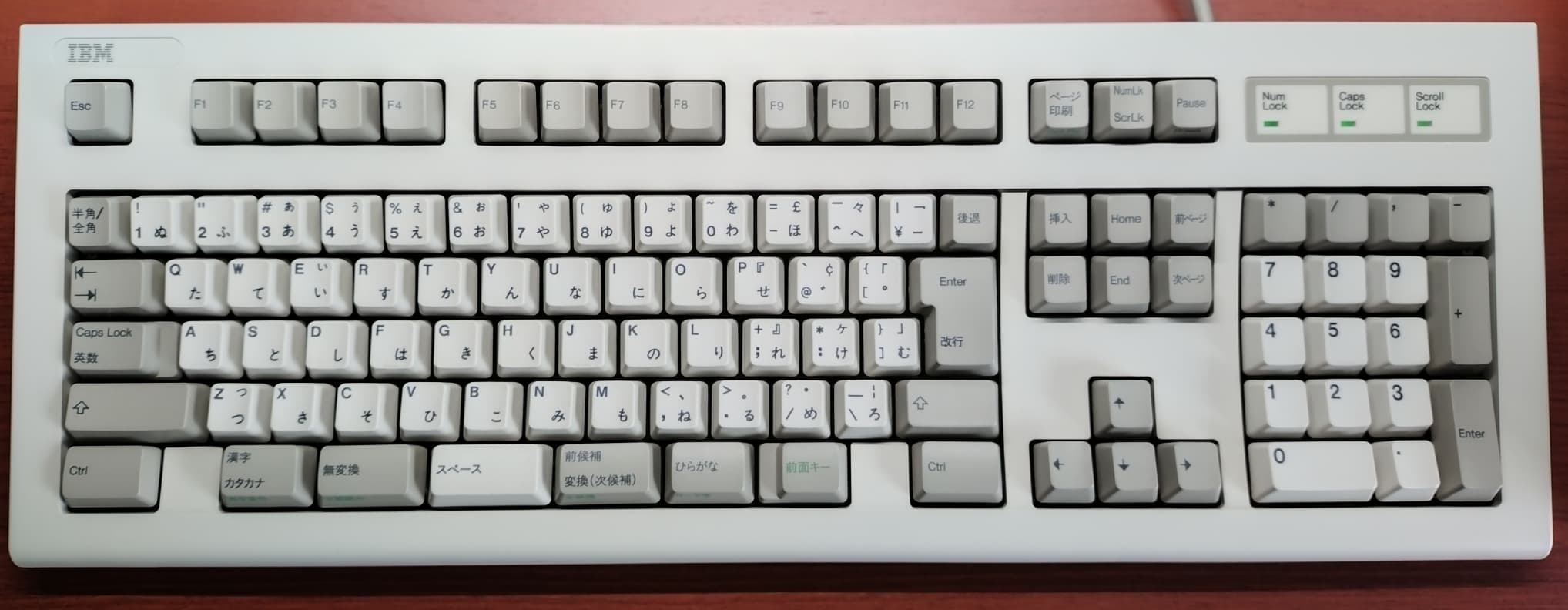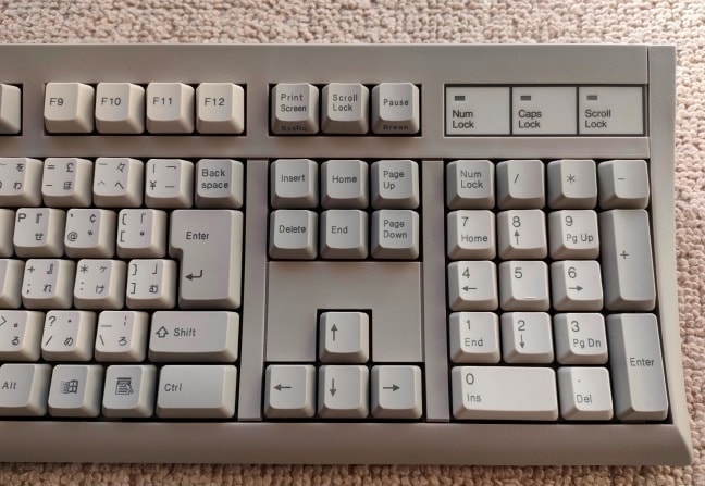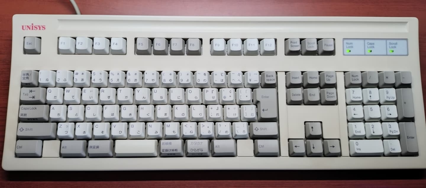 IBM 79F0167(5576-A01)「Model M」がANSI配列キーボードの始祖だとしたら、こちらの5576-A01はJIS配列の原点と呼んで差し支えない名機です。Model Mと同様のバックリングスプリング機構を採用していますが、ケースやハウジングの精度はこちらの方が高く、タイピングの反響音も心なしか上質な感じがします。「大理石をパチンコ玉で叩いたような音」とはよく言ったものです。 |