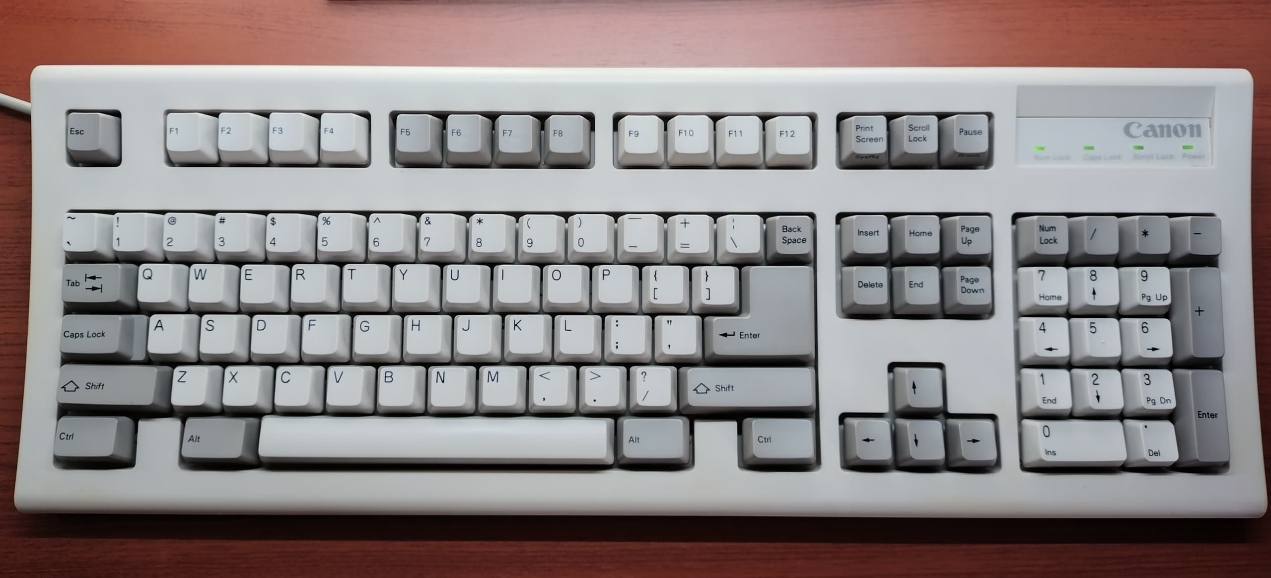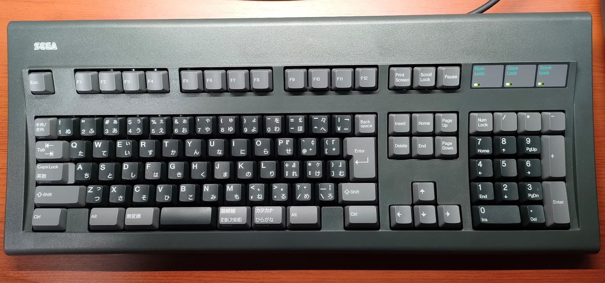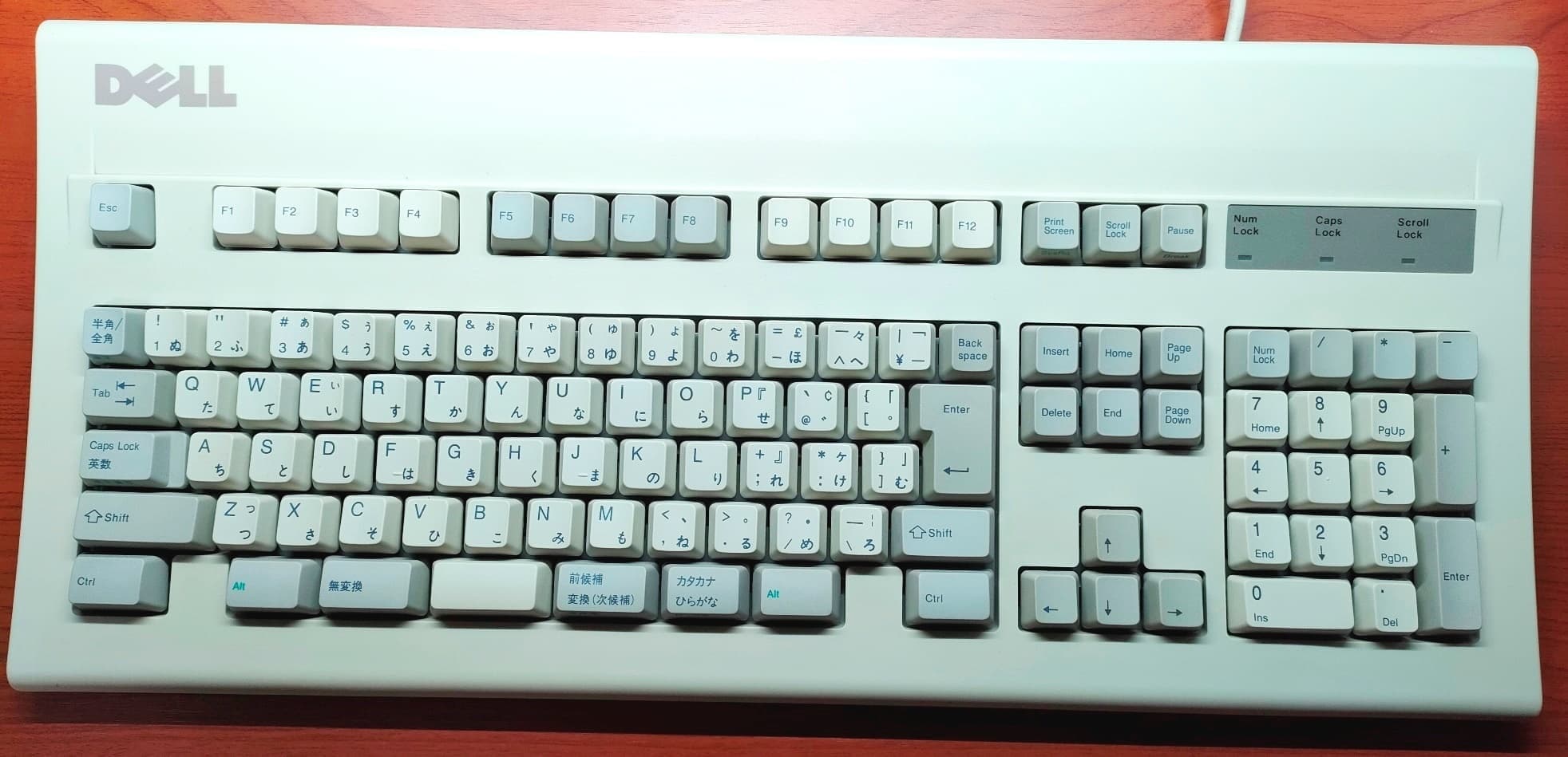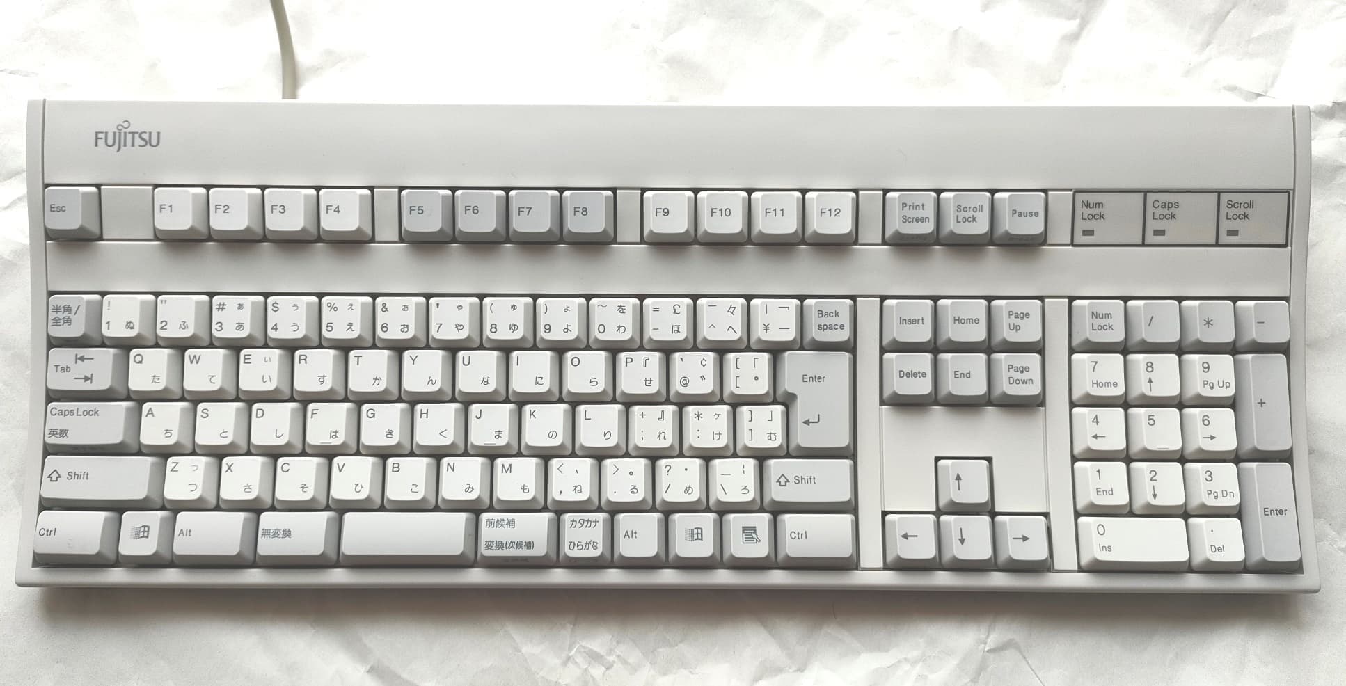 IBM 79F0167(5576-A01)「Model M」がANSI配列キーボードの始祖だとしたら、こちらの5576-A01はJIS配列の原点と呼んで差し支えない名機です。Model Mと同様のバックリングスプリング機構を採用していますが、ケースやハウジングの精度はこちらの方が高く、タイピングの反響音も心なしか上質な感じがします。「大理石をパチンコ玉で叩いたような音」とはよく言ったものです。 |