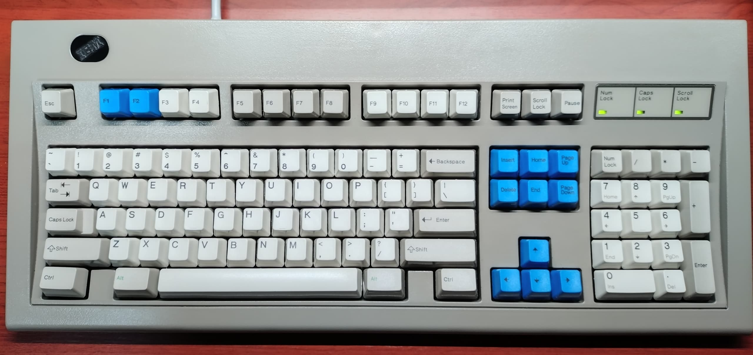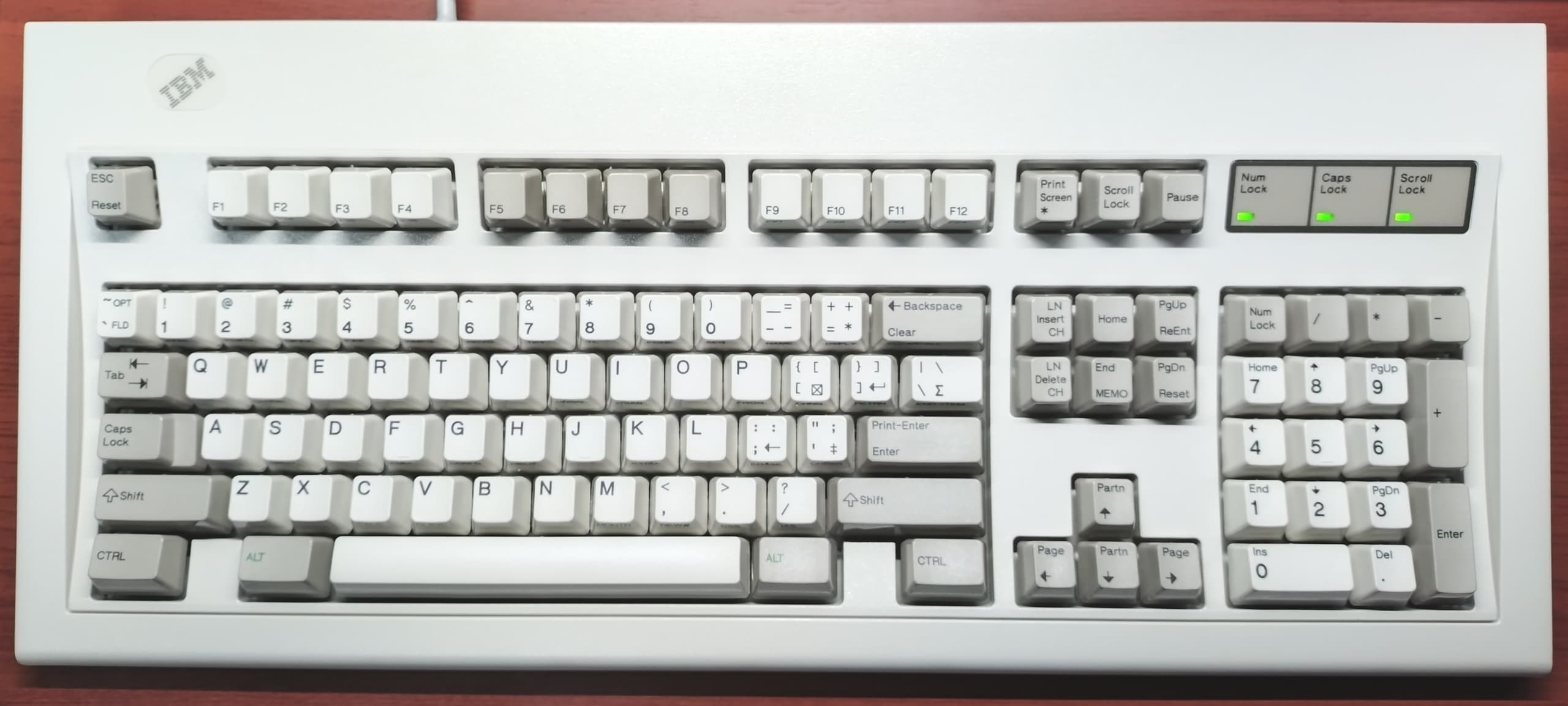 IBM 1390653 Model M1390131と同様の角ロゴながら、加えて黒バッジにインダストリアルグレーの筐体と、麻雀で言うところの「役満」状態なModel Mがこの1390653です。丸ロゴ・1394946のような排水機構こそ備えていませんが、LEDの配線がフィルムでなくケーブルタイプなのはメンテナンスの上でも助かります。 |