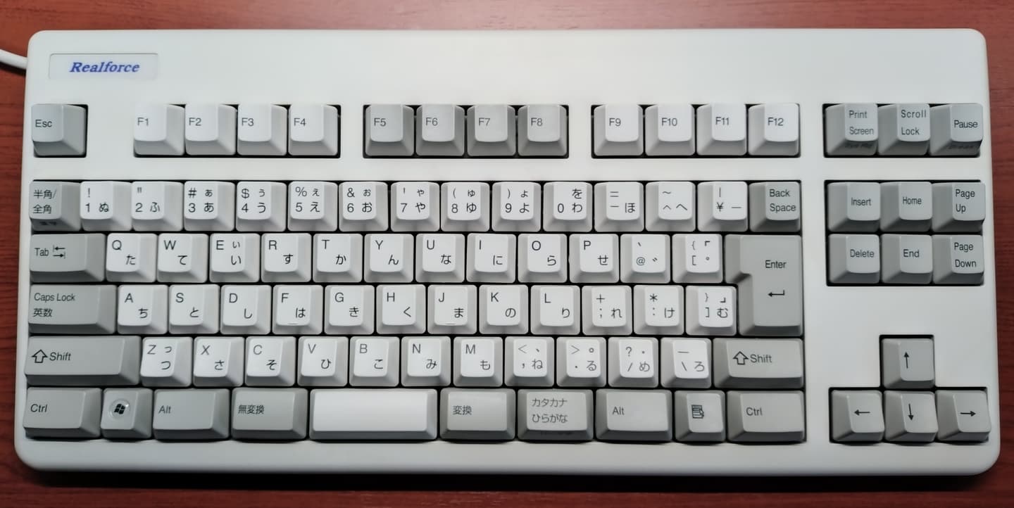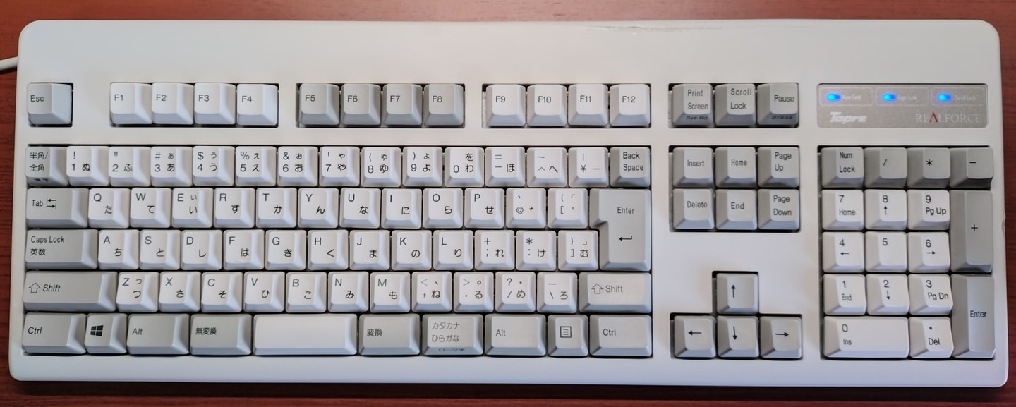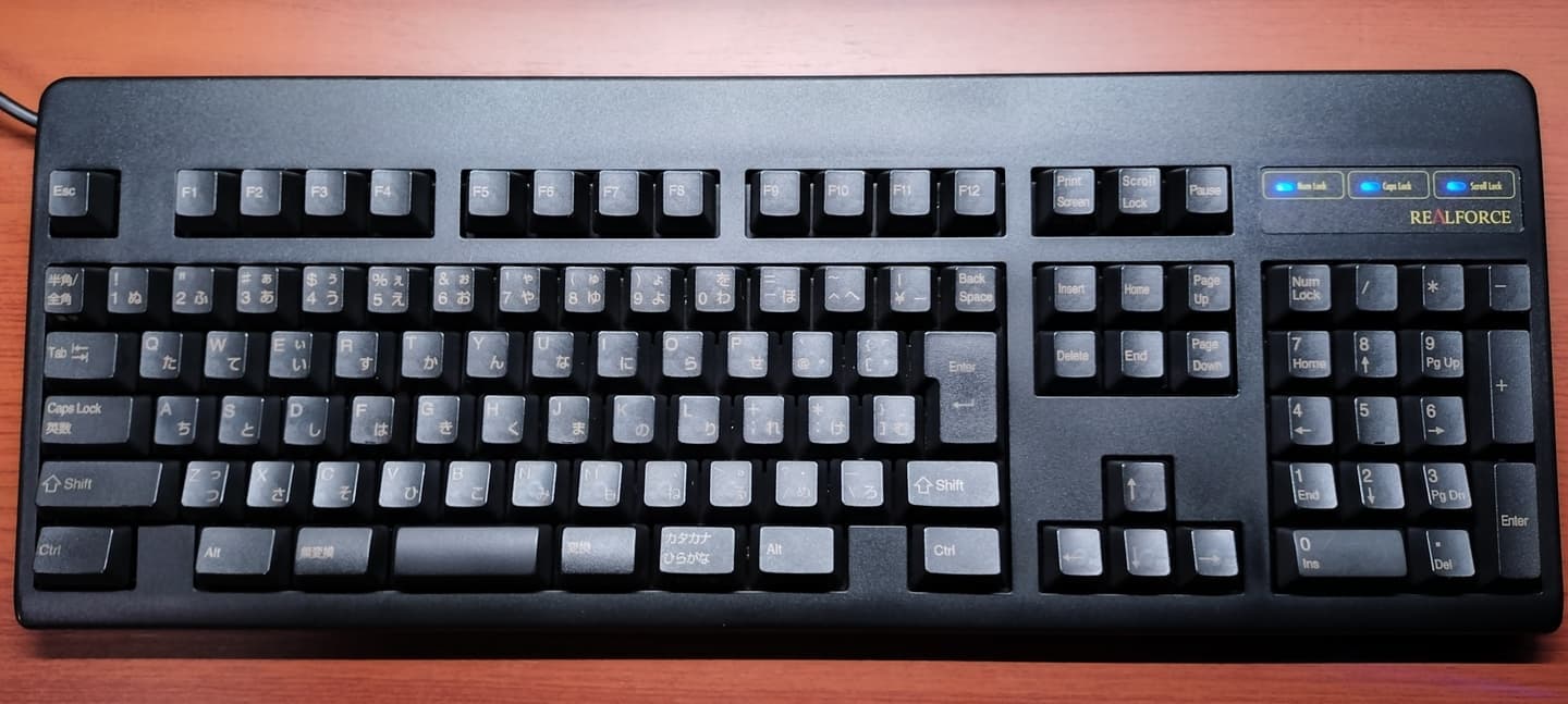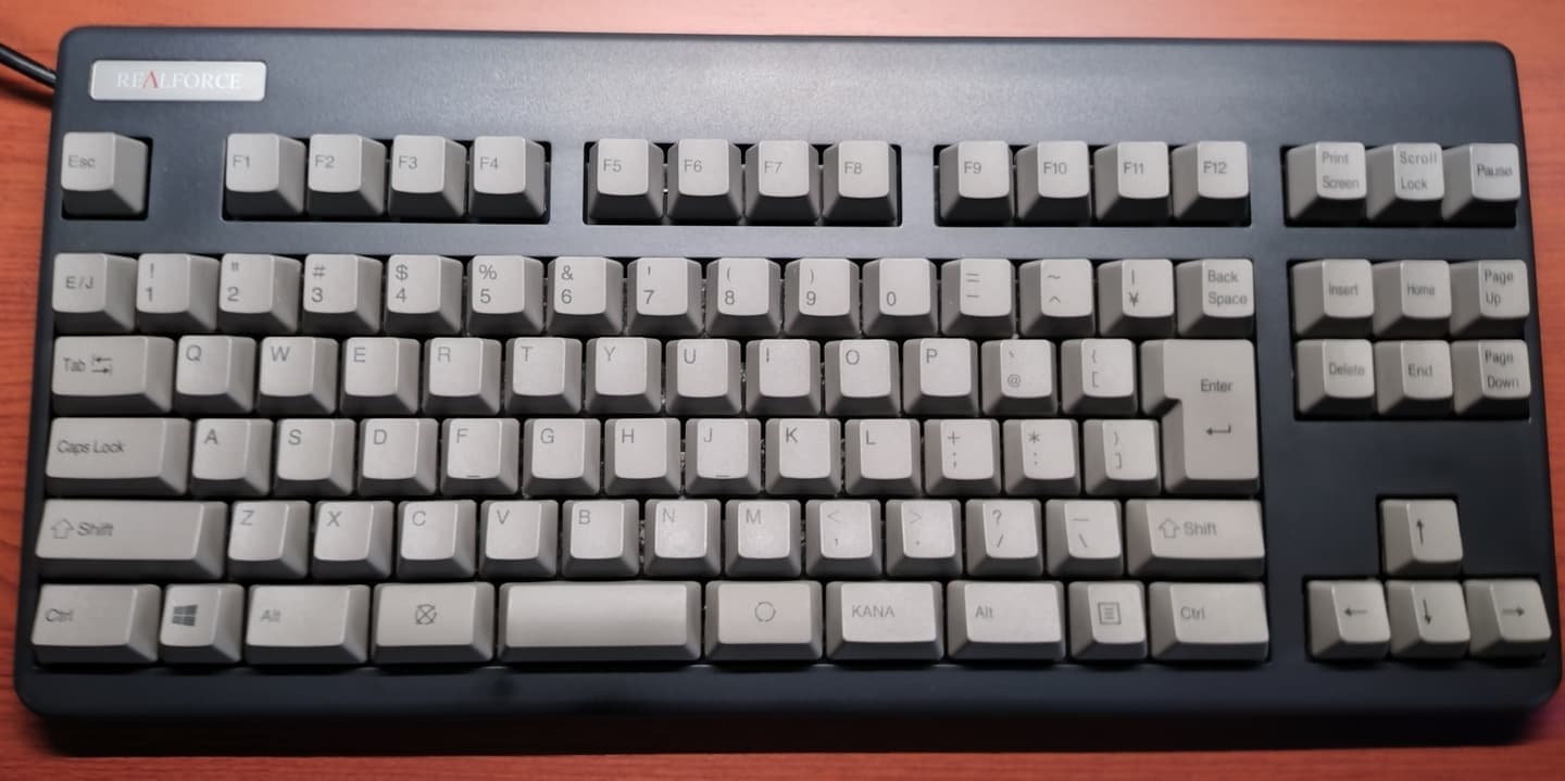 Topre REALFORCE 91(NE0100)REALFORCEの初代テンキーレス・89にWindowsキーとAppキーを追加、それ以外は特に違いません。ゲームにキーボードを使用する人には誤入力が邪魔になるかも知れない一方、パッド派の筆者にとっては両キーともあった方が助かっています。89キーモデルも同様ですが、初代89/91は左上のロゴが3種類あります。筆者はこの青いタイプが一番のお気に入りです。 |