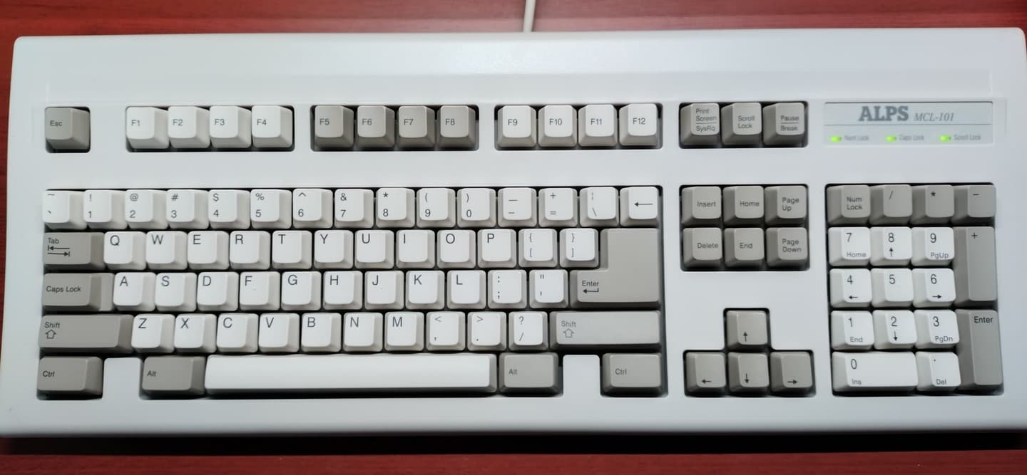 FOCUS FK-2001DIPスイッチカバーの「2001」とピアノ鍵盤を思わせるダストカバーが特徴的な、ALPS軸のキーボード。Focus Electronic社は NorthgateのOEM供給を行っていた関係もあり、同社の Omnikey 101に近い構造です。Fk-2001の採用軸には青や白、簡易など数種類が確認されていますが、所有モデルは珍しい青軸を搭載。ダストカバー&元箱付きの完全体です。 |