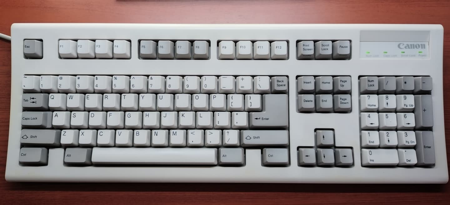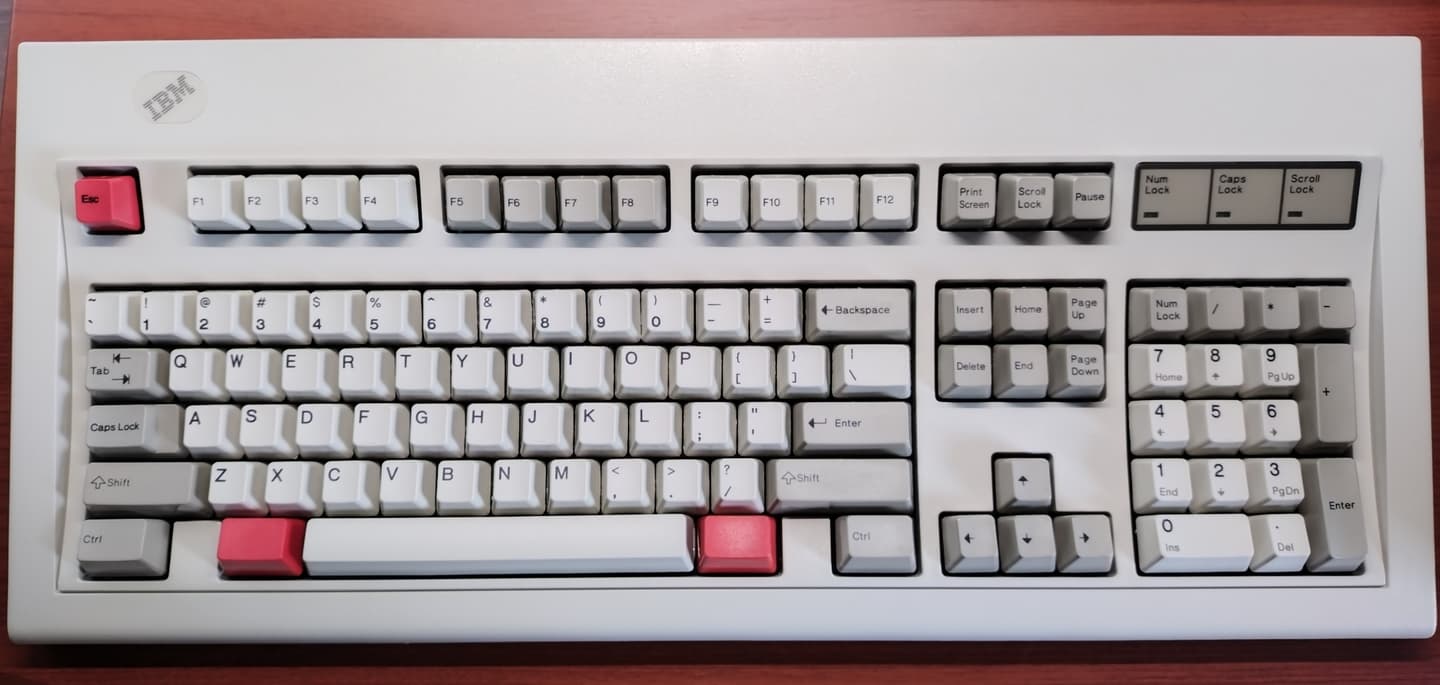 IBM 94X1110(5576-002)日本語配列のIBM鍵盤では5576-A01と人気を二分するモデル。ブラザー座屈ばねのA01と違い、こちらは柔らかなタッチのALPS式です。OADG準拠のキー配列登場前のモデルにつき全角/半角や「@」の入力には苦労しますが、某サイト経由で購入できたUSBコンバータのお陰でコードセットの問題も解消され非常に快適です。コンバータの有無いかんで、WIndows11時代における同機の評価は大きく変わります。それぐらいのマストアイテムです。 |