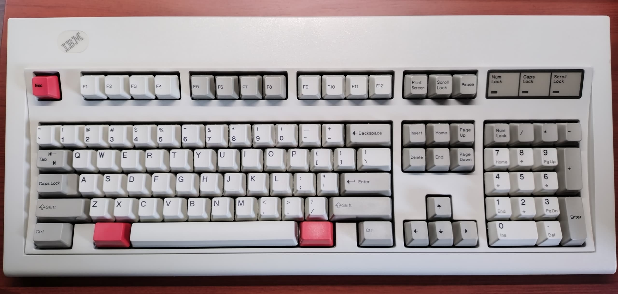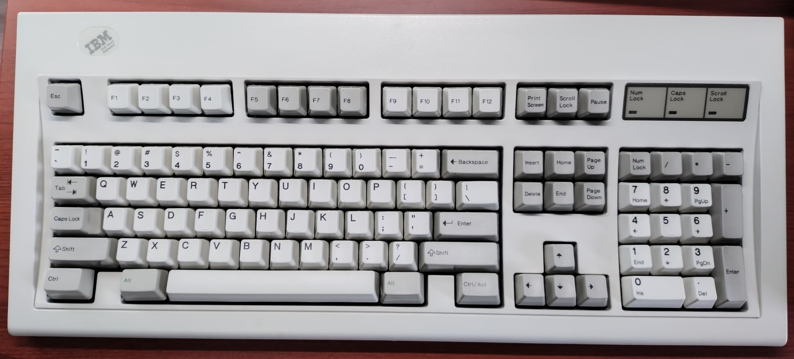 IBM 1394308/122 Type III Model M "Battle Cruiser"先代のType IやType II、通称"Battle Ship(戦艦)"に対しType III以降は一回り小さい"Battle Cruiser(巡洋艦)"と呼ばれますが、それでも迫力満点です。こちらの実寸は525×215mm、type IIと大差ありません。当時のキーボードにはロック表示のLED窓はないものの、最近のWindows11環境ではロック操作がディスプレイに表示されるようになったため、さほどの不便も感じません。良い時代になりました。 |