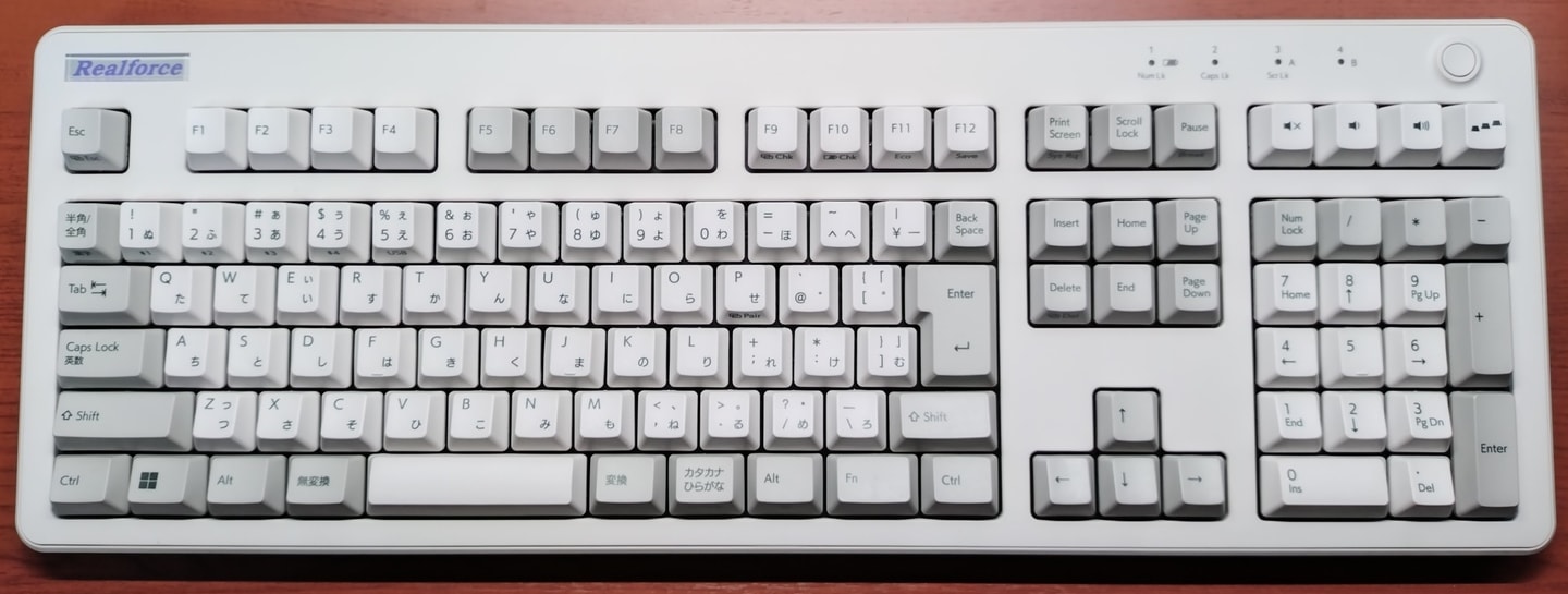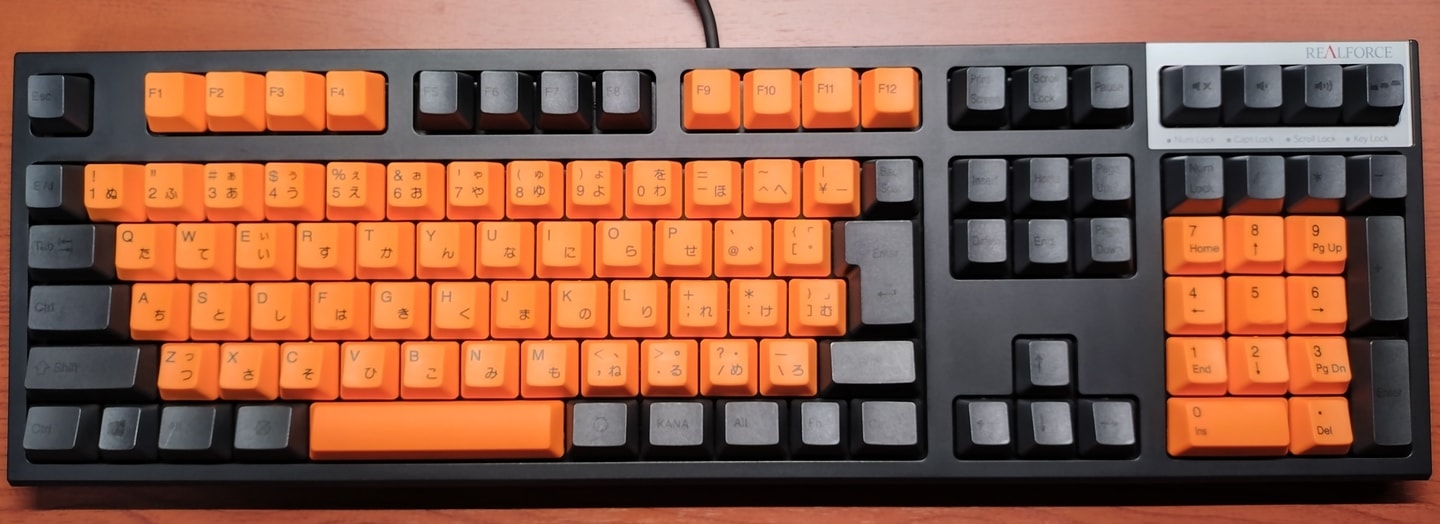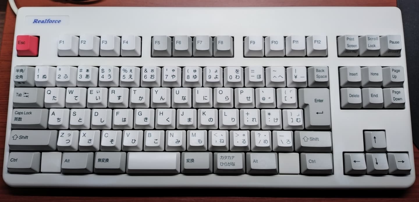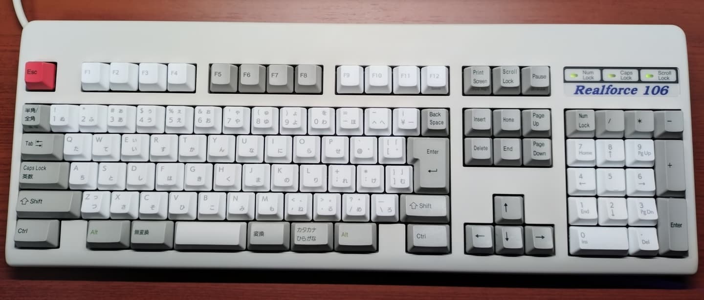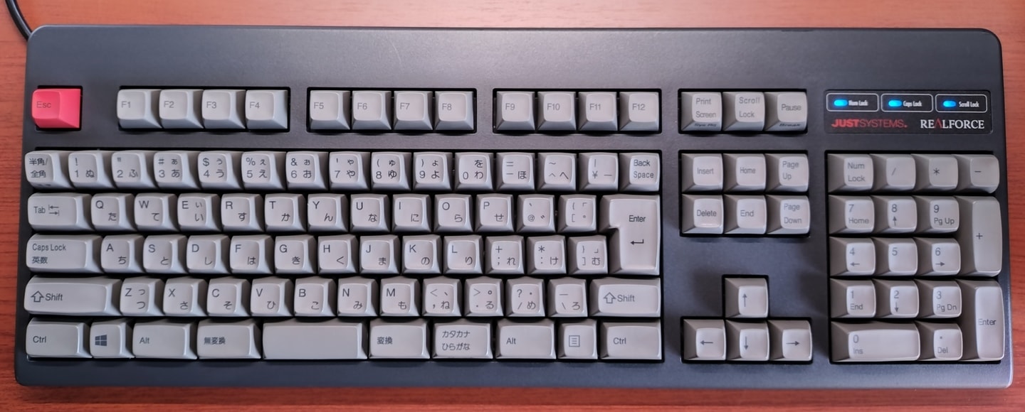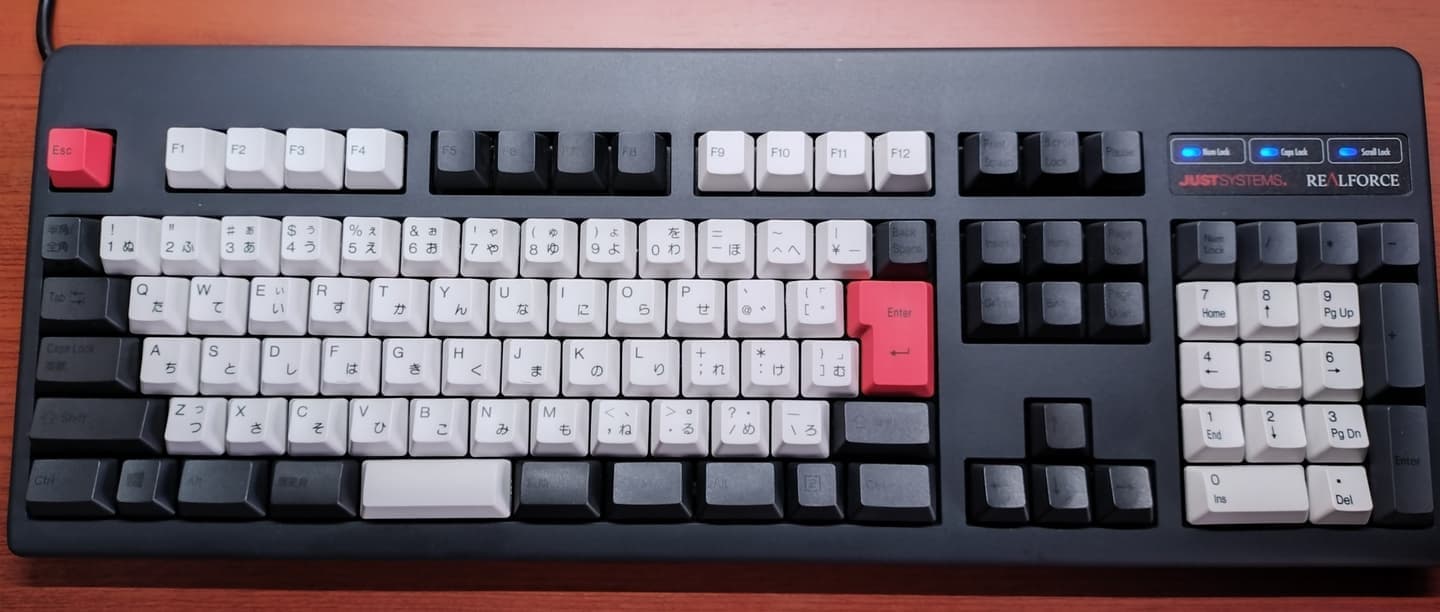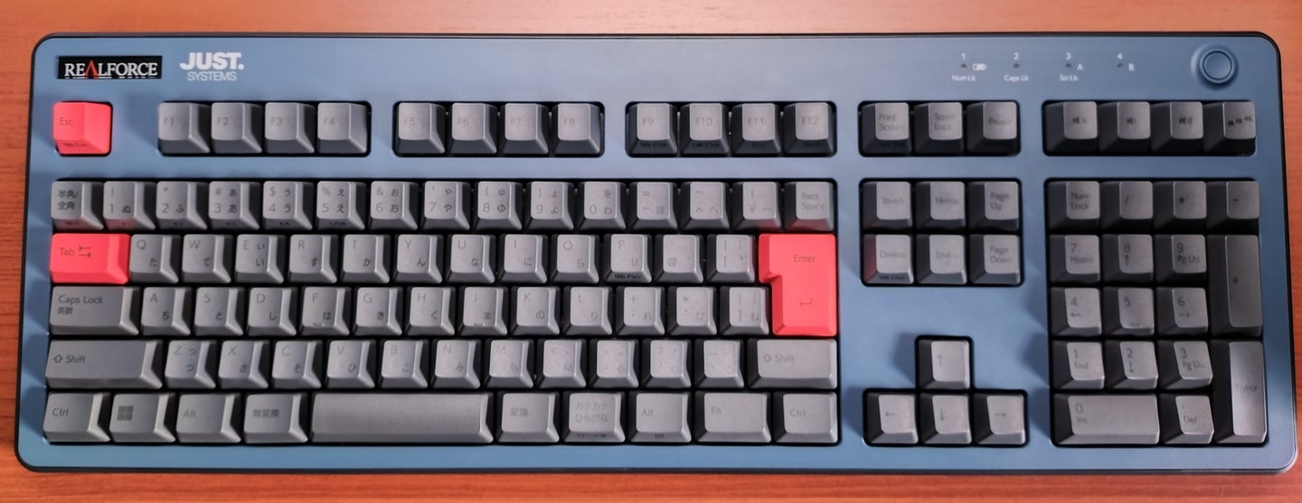 Topre REALFORCE 108UBK-JS(ZH0200)東プレとジャストシステムがタッグを組んだPJシリーズから、新たにZH~の型番と共に立ち上がった共同開発モデル。本モデルは先代ZH0100からのマイナーチェンジ的な1台で、キーキャップがABS製からかな有りの昇華印刷モデルに変更。かな有りの昇華印刷グレーはRealforceとしても初の採用になります。また従来はEscのみだった赤いキーがEnter他にも拡大、所有欲が一層くすぐられるようになりました。一方でグレーの昇華印刷は視認性に欠けるため、所有機ではメインキー他をホワイト系に交換。見映えよりも実用性を重視しています(これはこれで好き)。 |