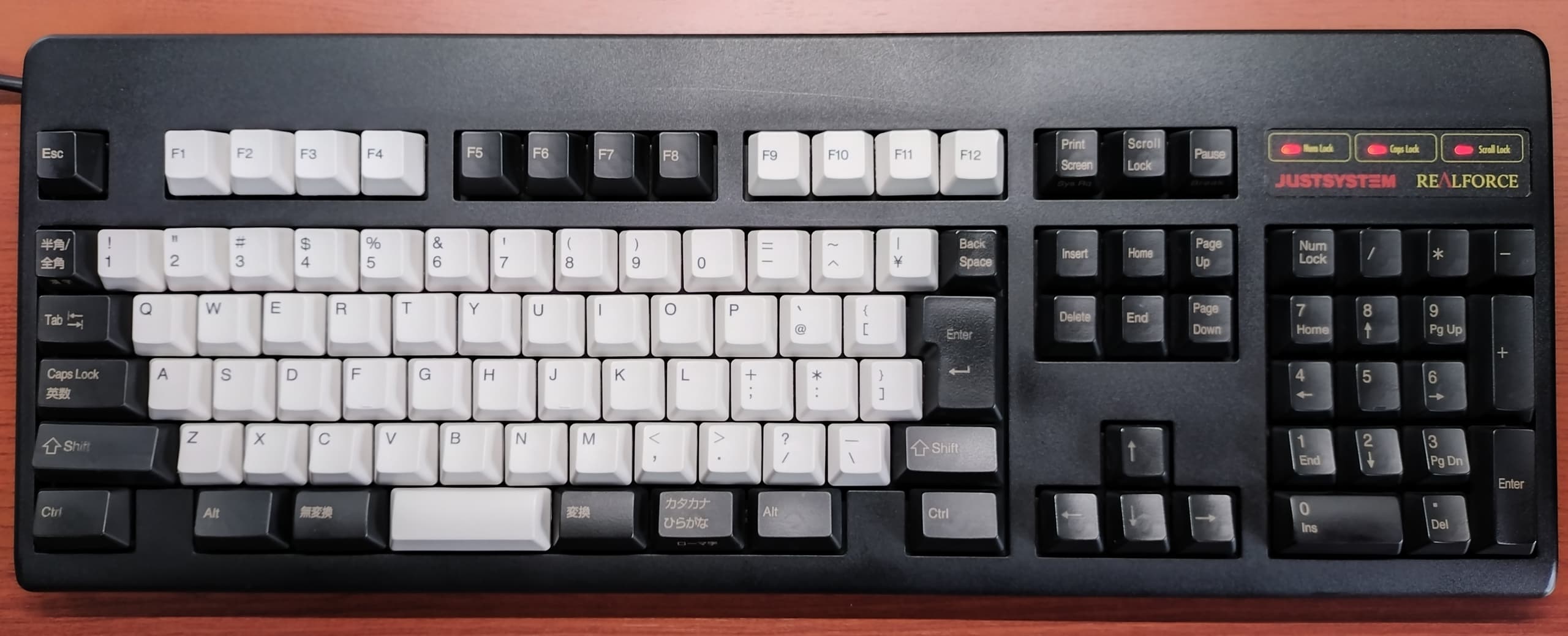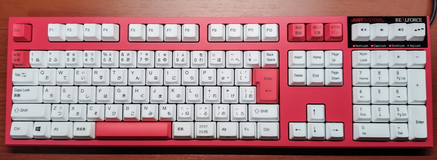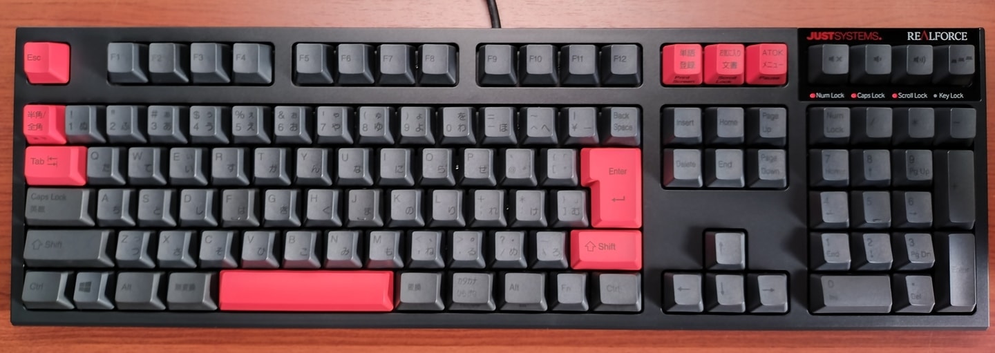 Topre REALFORCE CUSTOM Limited Edition(R2A-JP4-BKJ)第2世代REALFORCEとして初のジャストシステム共同開発モデルには、第一世代のようなZH型番でなく、R2シリーズの派生モデルとしての型番付与となりました。標準R2Aシリーズの基本機能に加え、機能キーがATOK向けにチューニングされています。その他にもジャストモデル特有のかな有りグレー、アクセントの赤などキーキャップが専用になっています。 |