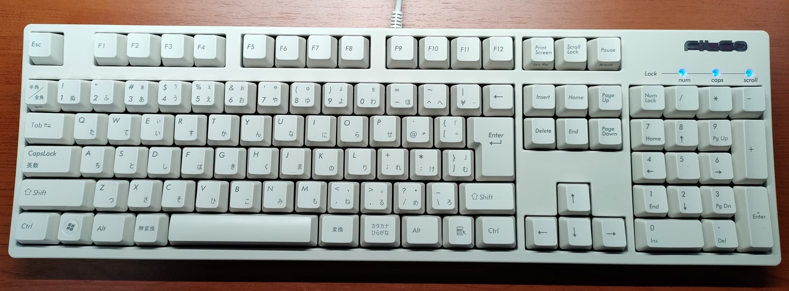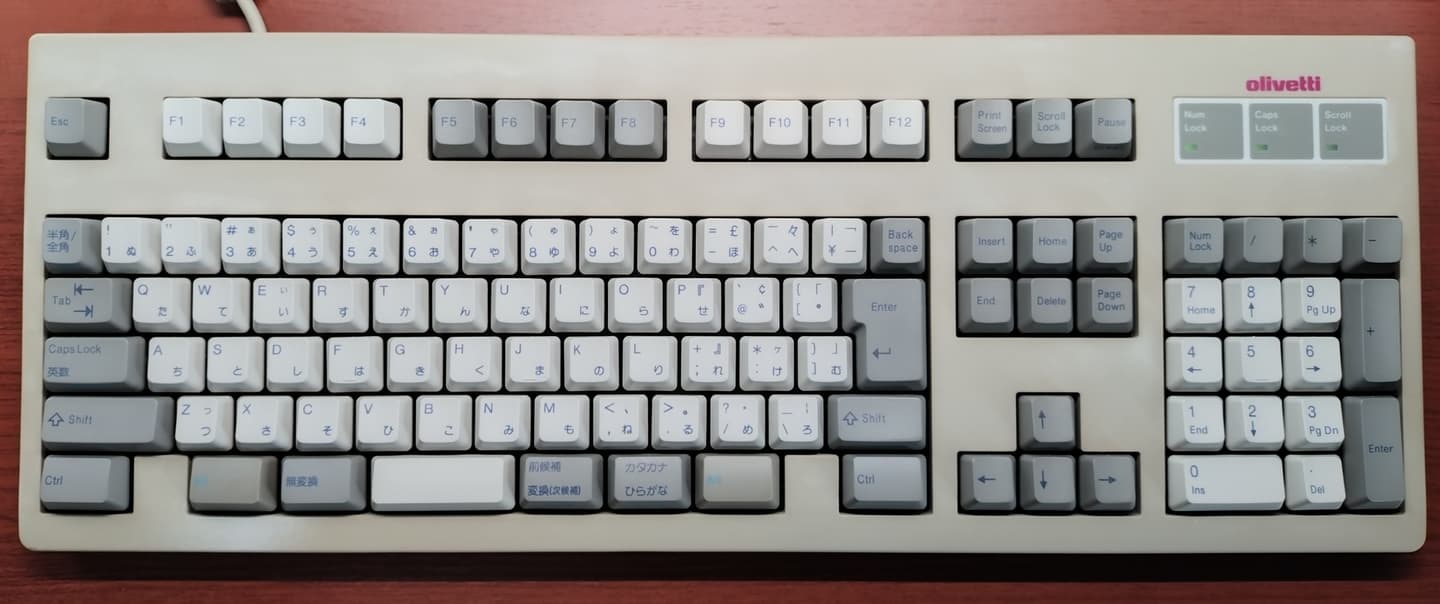 Olivetti ANK27-106J(8E021)オリベッティブランドのキーボードでも日本語配列は数種類あり、BTC製造のANK28-106JやFKB8724のOEMであるANK28-109Jなどが確認されています。うち青い印字は本モデルとBTC製の2種類のみですが(28-109Jは素っ気ない黒印字)、ABSキーキャップにプリント印刷のBTC製と異なりこちらは名機FMV-KB311のOEM、つまり昇華印刷のPBTキーです。この差は大きい。青いキートップ印字が目を惹きますが、それ以上に前面の差し色(チェレステ、空色)が美しい一台です。 |