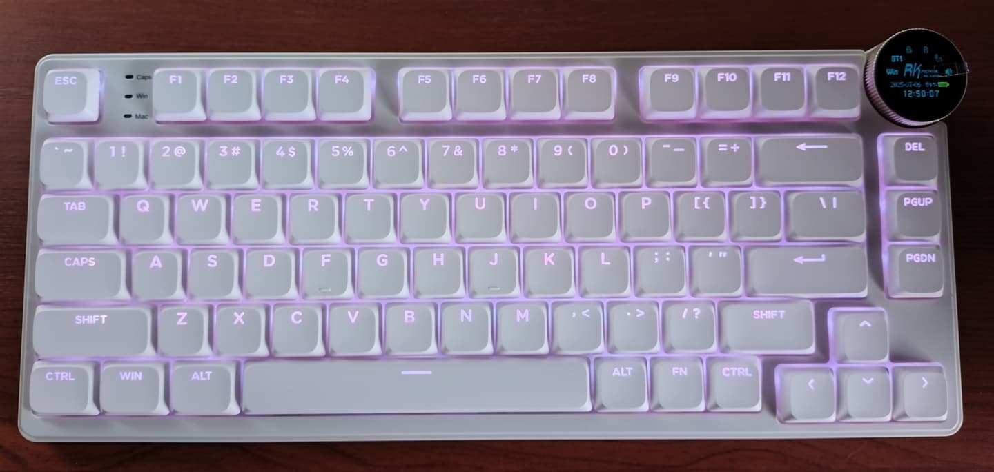 ROYAL KLUDGE N80コストパフォーマンスの高いコンパクトサイズキーボードを次々とリリースしているRK(ROYAL KLUGDE)のロープロファイル・ノブ付きのキーボード。日本語配列主体の筆者コレクションでは珍しい、US配列のテンキーレスです。 ノブ部分には液晶ディスプレイが内蔵されており、またキーボード本体もRGB付のホットスワップ対応、ケーブル/USBドングル/Bluetoothの3-Way接続などの充実ぶりです。唯一不満だったABSキーキャップはXVX製の透過PBTタイプに交換、これだけで完全体に近づきます。 |