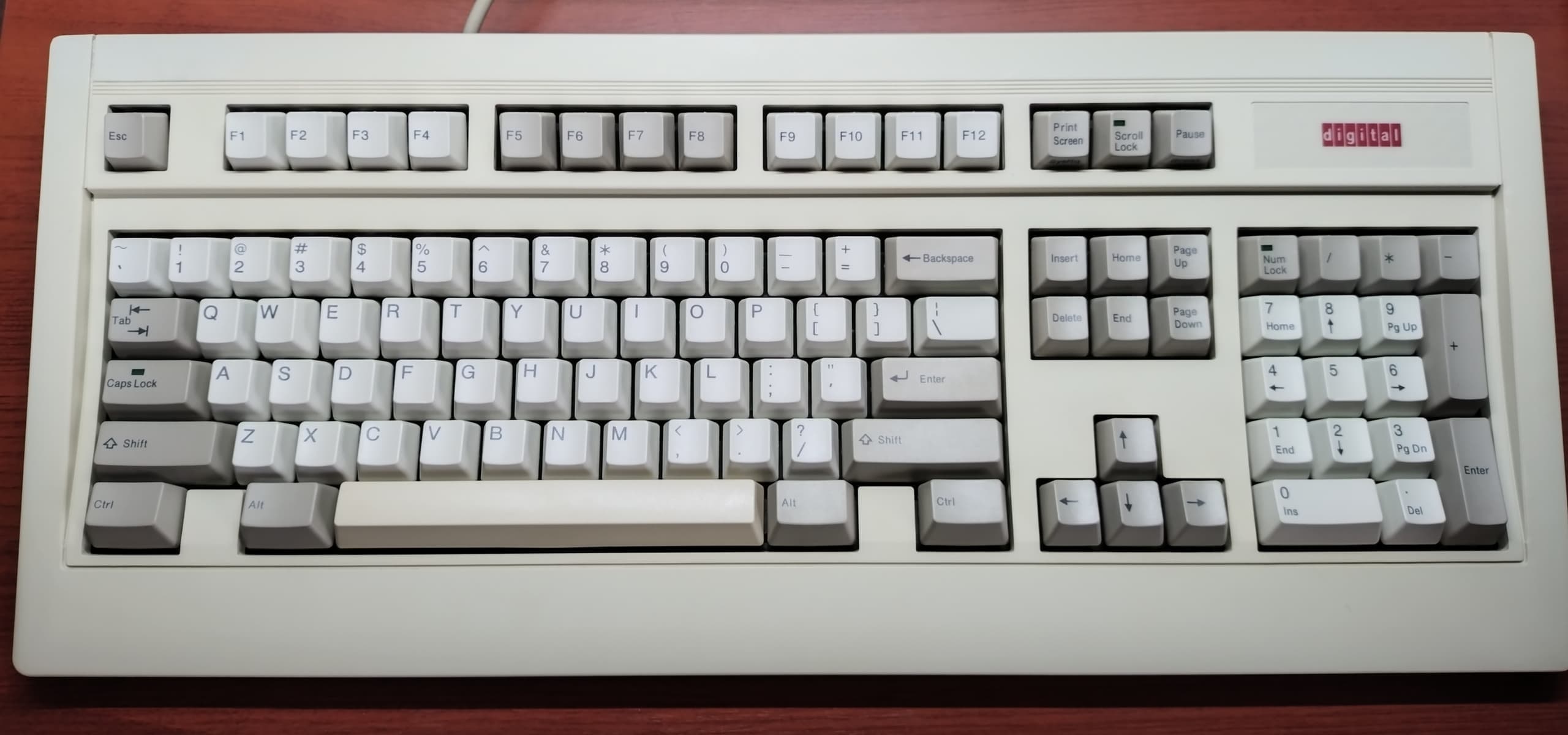 DEC PCXAJ-AA B01(FMV-KB311 OEM)DEC(Digital Equipment Corporation)ブランドのキーボードはChiconyやNMBなど複数のOEMモデルが存在します。本モデルもその中のひとつで、中身は富士通FMV-KB311とほぼ一緒です。それゆえコメントは311に譲りますが、かつてはSun、SGIなどともUNIX市場の覇権を争ったブランドゆえ、キーボードにも単なる入力装置以上の畏怖を感じます。筆者にとってのDECコーポレートカラーはバーガンディ(深い赤紫)ですが、グレーだと随分あっさりした印象です。 |