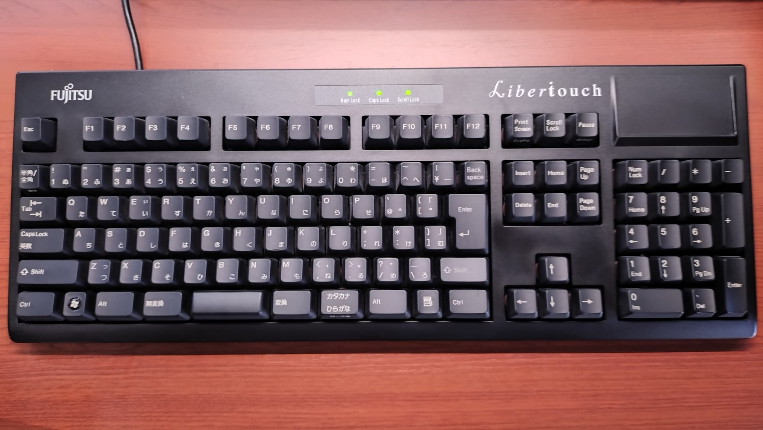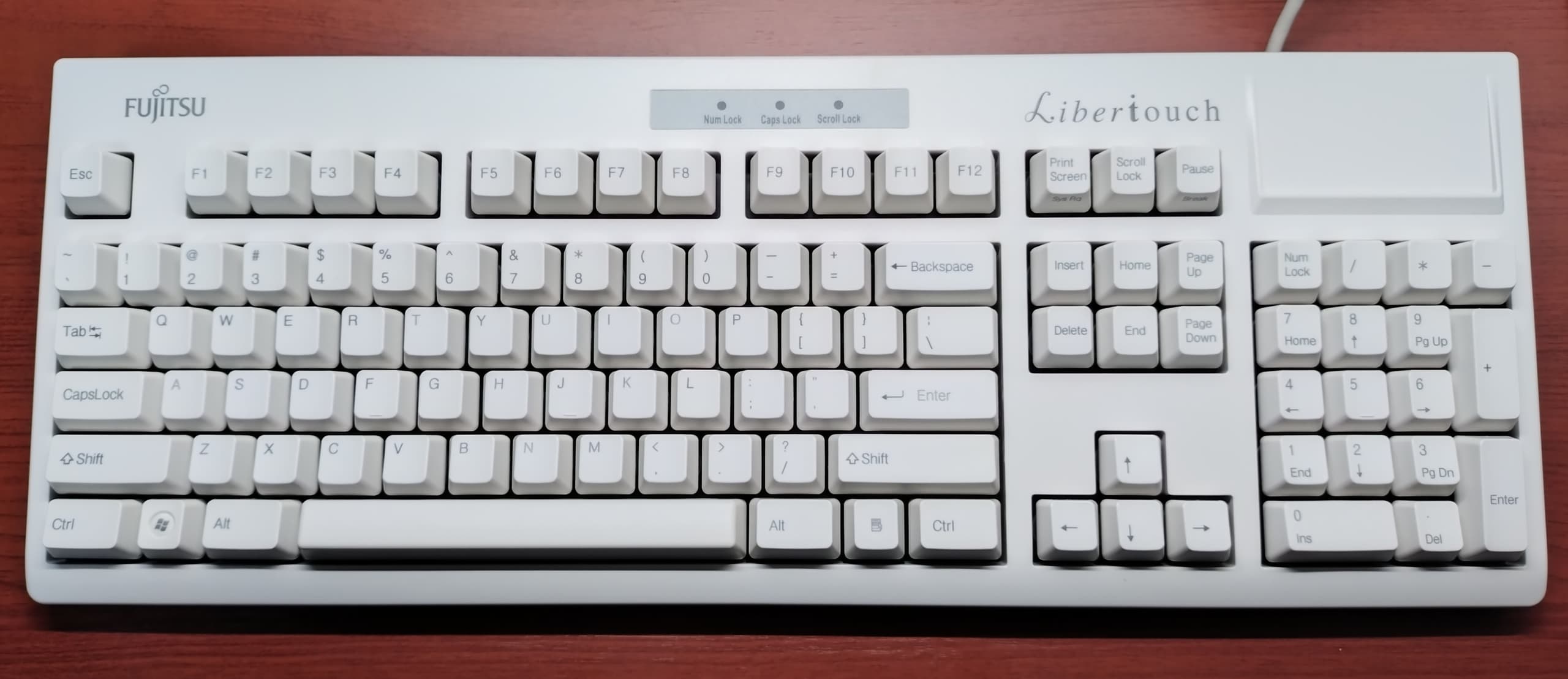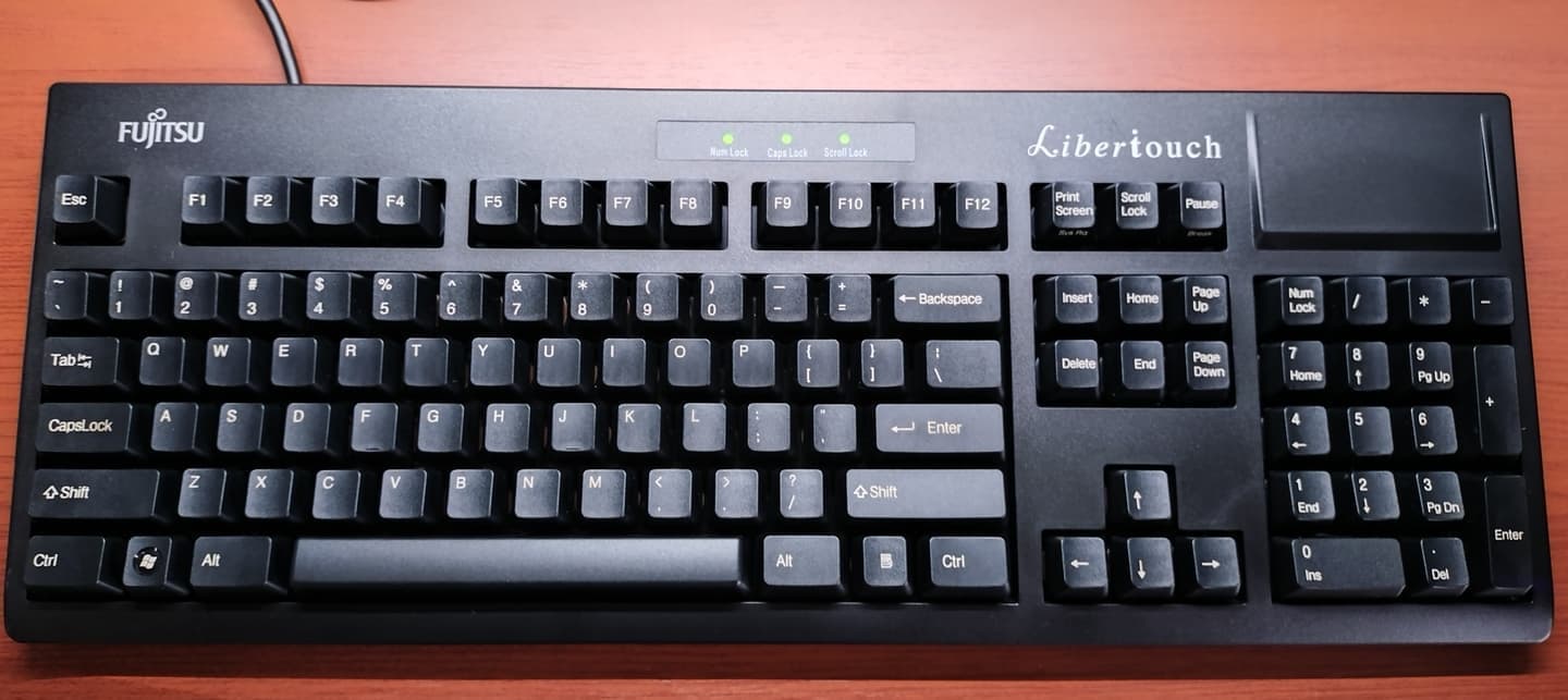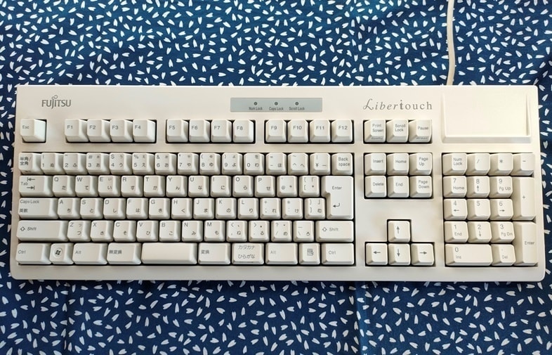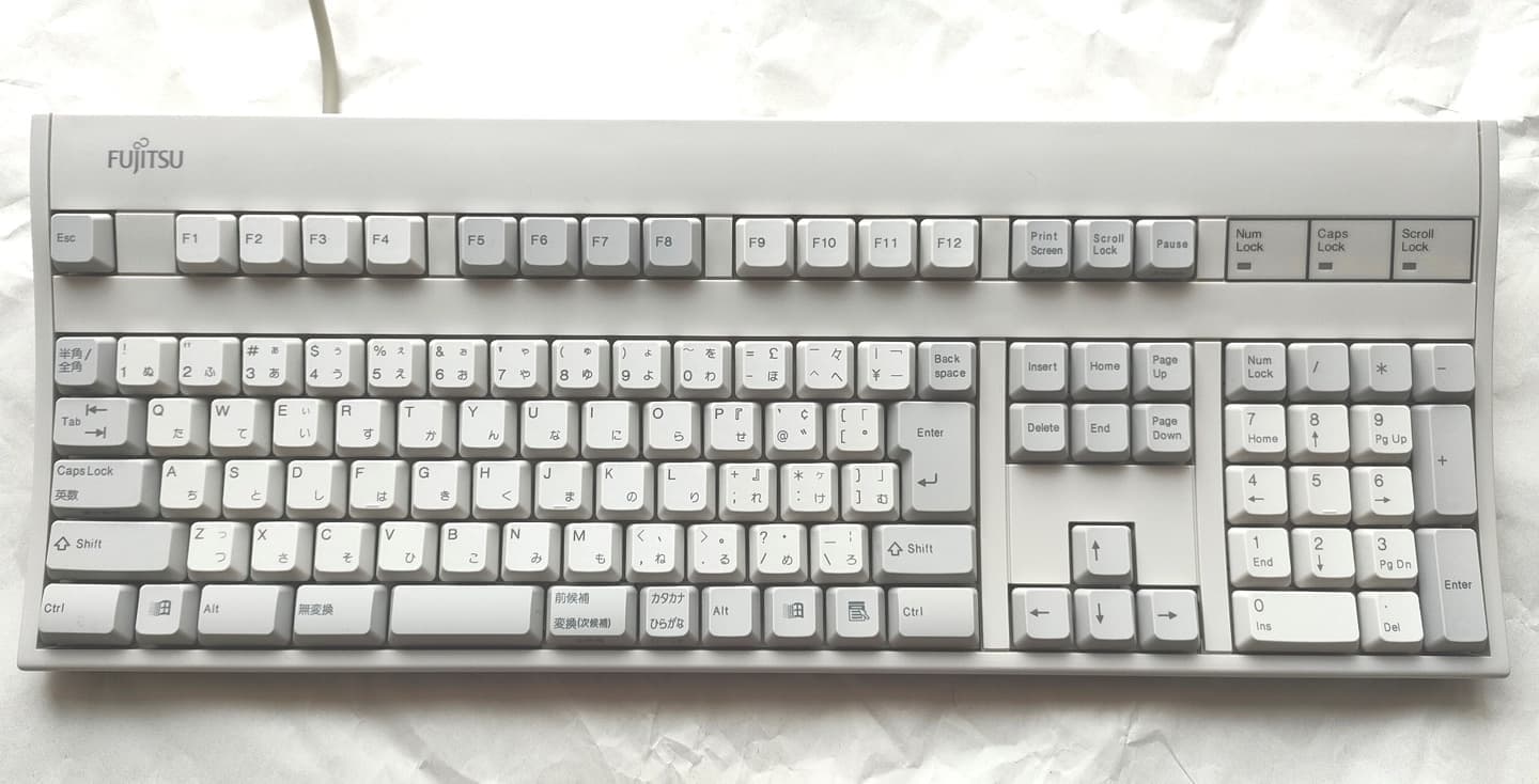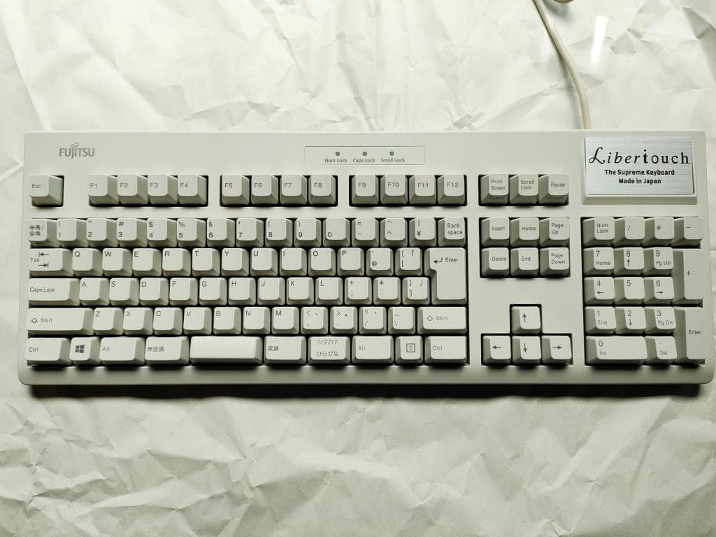 Fujitsu Component FKB8520-101/S1それまで主に富士通(株)PC付属品の生産を行なっていた富士通コンポーネントが、FMV-KB311を自社ブランド製品として販売したモデル。ケースや外観は黄変かと思いきや、地もアイボリーでした。キーキャップはオリジナルのPBTからレーザーマーキングのABS製ですが、当時(2004年~)は環境配慮の観点からインク不使用のレーザーが重用され始めた時期でもありました。その流れが後続モデルのキーキャップ仕様にも繋がったと思われますが、所有機ではPBT製に交換しています。 まったくの余談でですが、恐らくはこのS1こそが後のLibertouch開発/発売への導線となった、ある意味でのプロトタイプと捉えています。 |