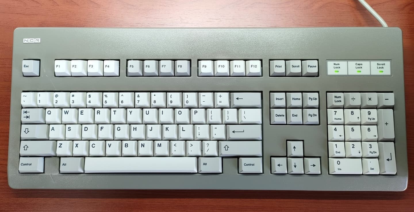 NCR H0150-STD1-12-17(G81-3077)MXメカニカルスイッチで有名な独・Cherry社。同社キーボードの中でも、オリベッティ向けのKBD2812(G81-3000)、TA(Triumph Adler)向けのG81-3011と並ぶ「ビンテージCherry御三家」のひとつです。IBMのModel M、DELLやSGIのBigFootに比べると地味ですが、個人的には両者に並ぶビンテージキーボードの花形です。 |