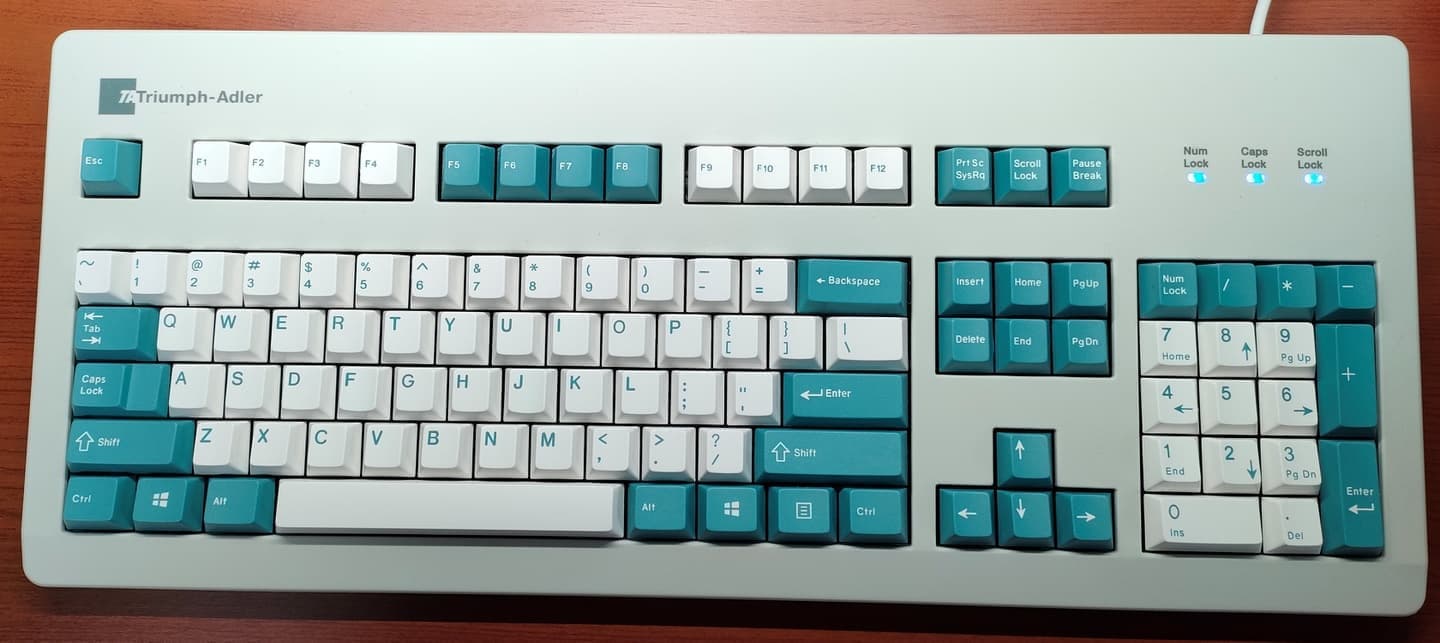Triumph Adler G81-3000ビンテージCherryの中でも、Olivettiの「KBD2812」やNCRの「H0150-STD1-12-17(G81-3077)」と並ぶ御三家が、Triumpth Adler(トライアンフ・アドラー)のG81-30xxシリーズです。同社のPC「Dario」向けにグレー/ターコイズのキーキャップをあしらったTA「G81-3011HAD」に比べると華やかさに欠けますが、それでもKBD2812ばりのロイヤルブルーPBTキーキャップはOlivetti向けの兄弟モデルとして異彩を放ちます。 |