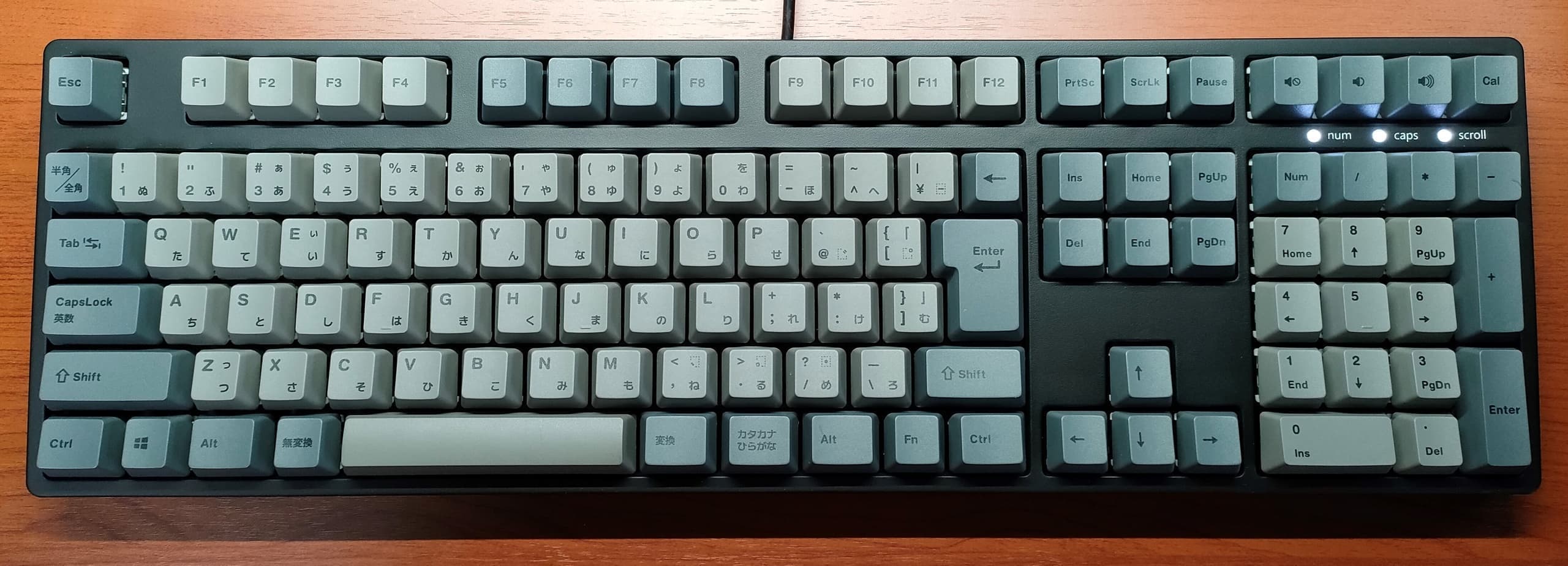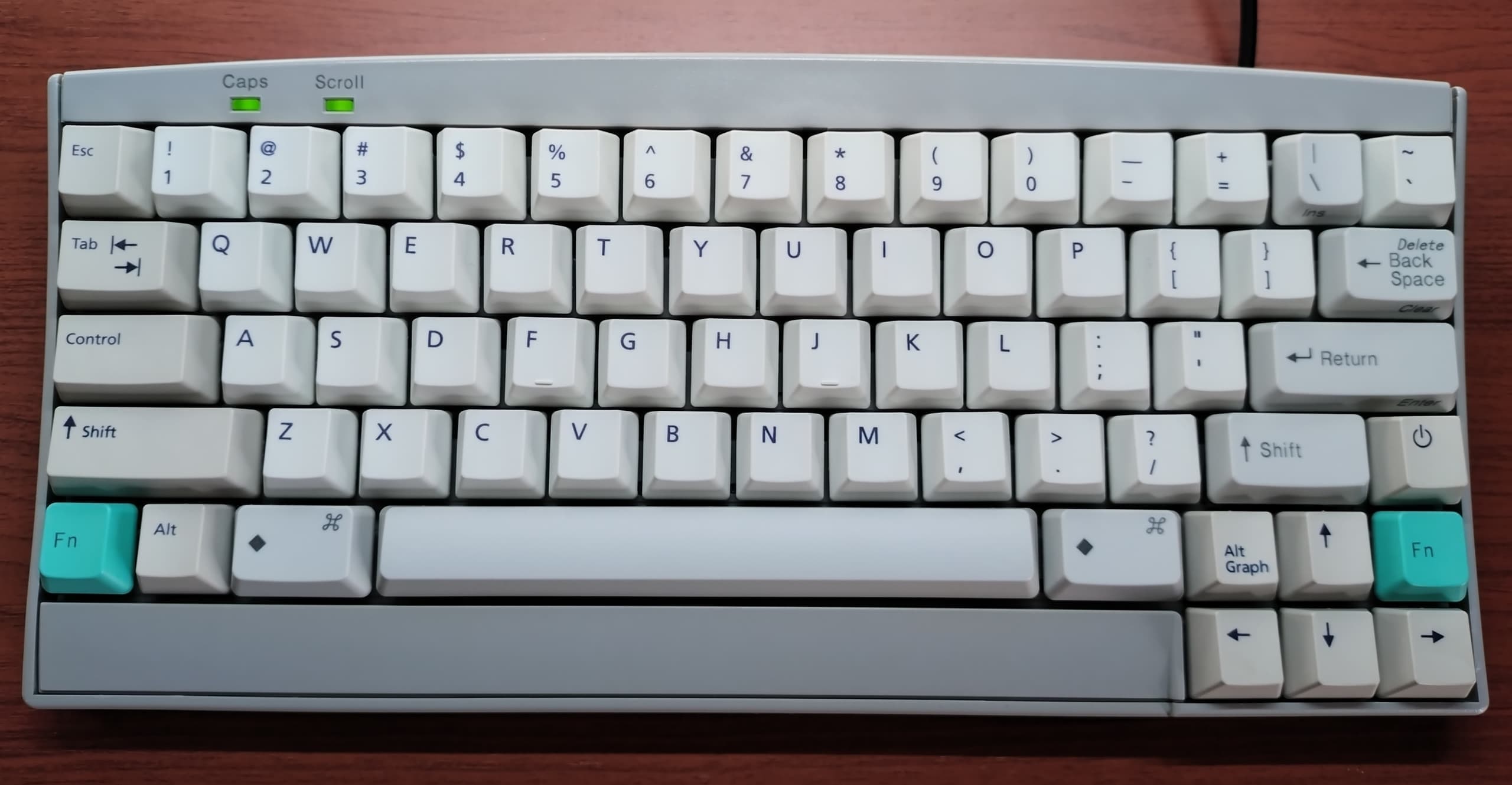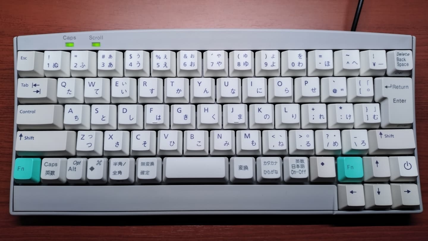 巷間では「HHKBキラー」とも呼ばれ、緑のFnキーが印象的なぷらっとホームの独自企画モデル、FKB8579。日本語配列の型番は後ろに-JISが付きますが、UNIXレイアウトのこちらは8579止まり。メーカーとしては恐らくこちらがオリジナルなのでしょう。初代HHKBでは方向キーがFnとの併用だったため多少の不便さを伴いましたが、比べてみるとありがたみを実感します。キーキャップはSunのType5~7と互換性があり、Type5のPBTキャップに入れ替えています。
