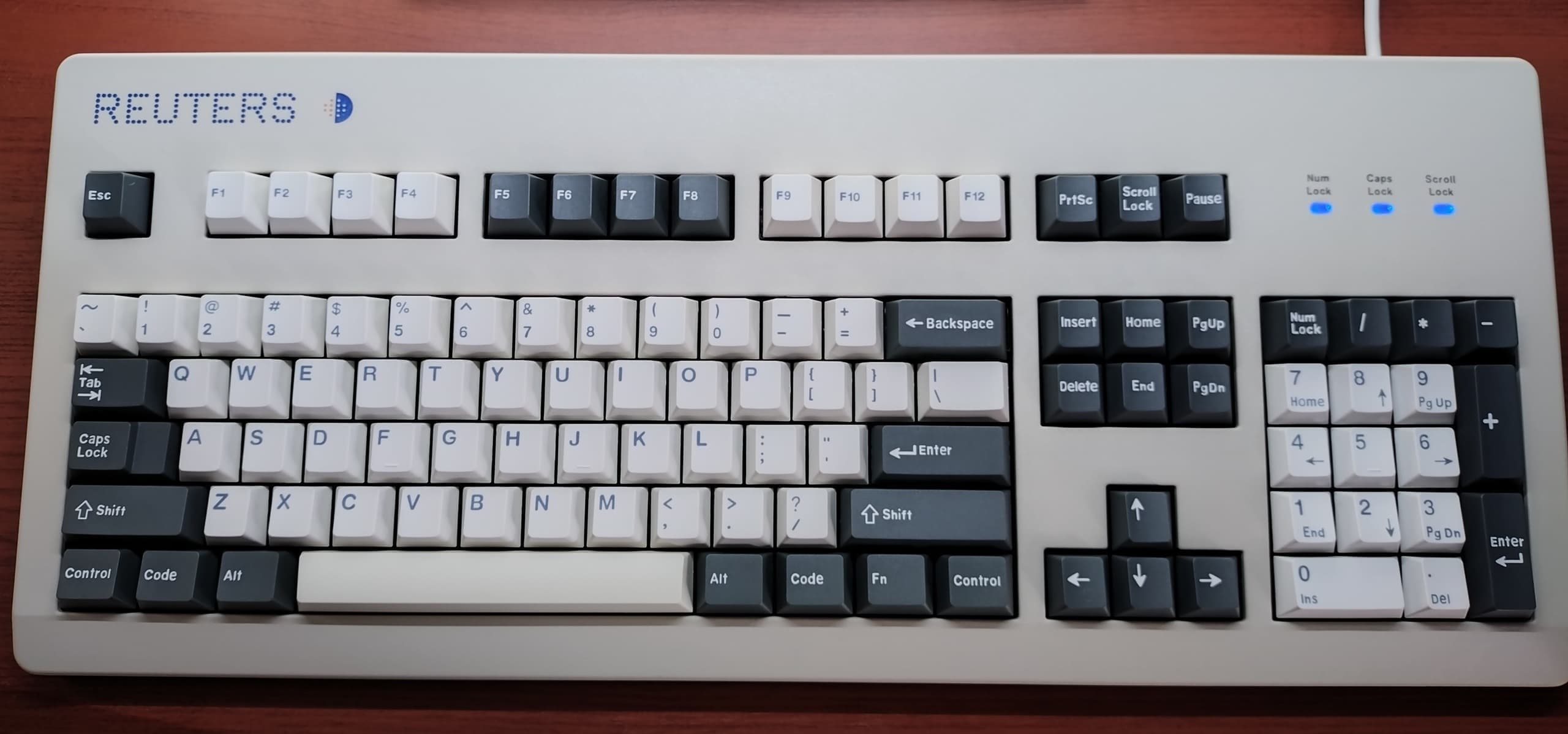 GE Healthcare Model M 2054858-001IBMからBuckling Springの技術を受け継いだUNICOMP社が、GE Healthcare(GE Medical Systems)向けに製造した医療用途のModel M。航空システム向けに作られた「Sabre Version」よりも印字が特殊です。アルファベットキーやFnキーの入力はさほど苦労しませんが、数字が全く振られていないテンキー部分は慣れるのにもひと苦労。それでもこうした特定業種向けのキーボードは、叩くだけでも気持ちが乗ります。 |
