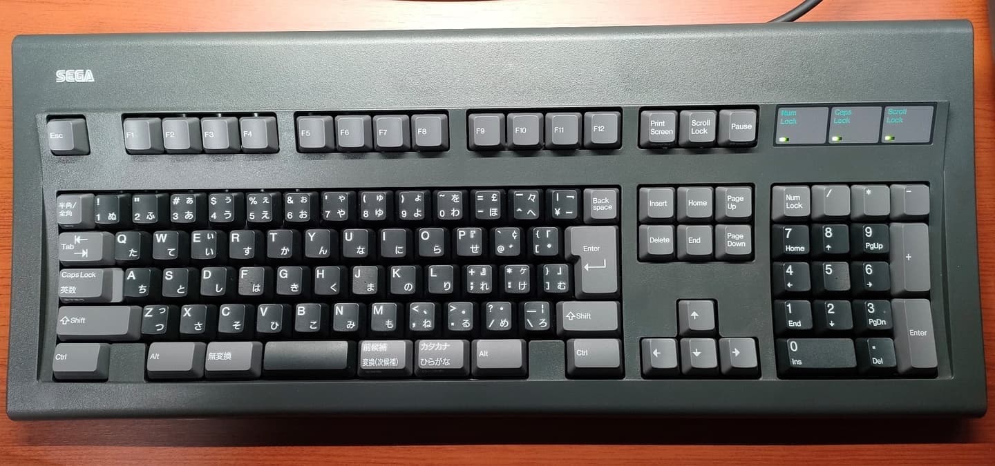SEGA HTR-2106 TERADRIVE KEYBOARDSEGAの家庭用ゲーム機「メガドライブ」とIBM-PCを合体させた異色のマシン・TERADRIVE(テラドライブ)専用のキーボード。Model Mほどの頑強さではないものの、家庭用マシンとしては豪勢なALPS製のバックリングスプリング式です。タッチそのものはModel Mやブラザー製の5576-A01よりも5576-002に近く、この辺は流石ALPS製と言った感じです。 |